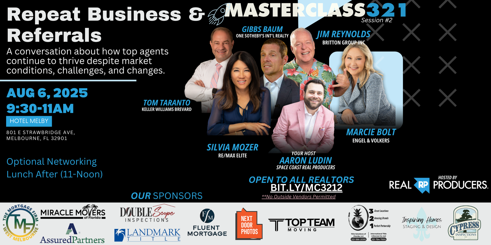 Featuring Panelists: Tom Taranto (Keller Williams Brevard), Silvia Mozer (RE/MAX Elite),Gibbs Baum(One Sotheby's Int'l Realty), Jim Reynolds(Britton Group INC), and Marcie Bolt(Engel & Volkers)